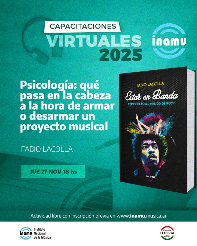Fabio Lacolla, músico, escritor y psicólogo de artistas musicales desarrolla qué cosas pasan en un proyecto musical puertas adentro. Una capacitación que abordará el perfil psicológico de los músicos, su narcisismo, la relación entre la persona y el personaje escénico, y los estados emocionales que atraviesa. También se vislumbrarán las dinámicas, conflictos y ansiedades de las agrupaciones musicales. Esta actividad se basa su libro "Estar en banda", un escrito que ofrece una mirada profunda sobre la relación entre psicología y música desde la perspectiva de los propios protagonistas del rock.