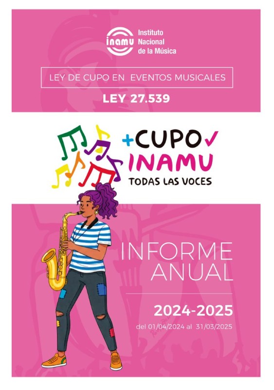 Como lo establece la Ley N° 27.539, el Instituto Nacional de la Música (INAMU) como su órgano de aplicación, que en su reglamentación incluye a las Personas de Identidad de Género Autopercibida, debe elaborar un informe anual sobre el cumplimiento de esta normativa. Por tal motivo, el INAMU pone a disposición el Informe elaborado por la Unidad de Ley de Cupo que corresponde al período 01/04/2024 al 31/03/2025, dando cuenta de las declaraciones juradas recibidas y denuncias por presunto incumplimiento de la Ley en eventos musicales nacionales.